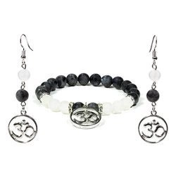 Bransoletka i Kolczyki Labradoryt i Biały Agat z Symbolem OM